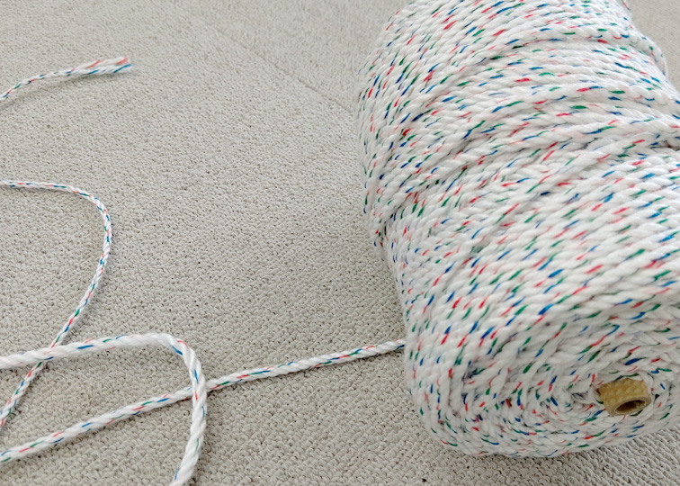 白を基調としたロープに、赤・青・緑の色線をいれたおしゃれな紐です。