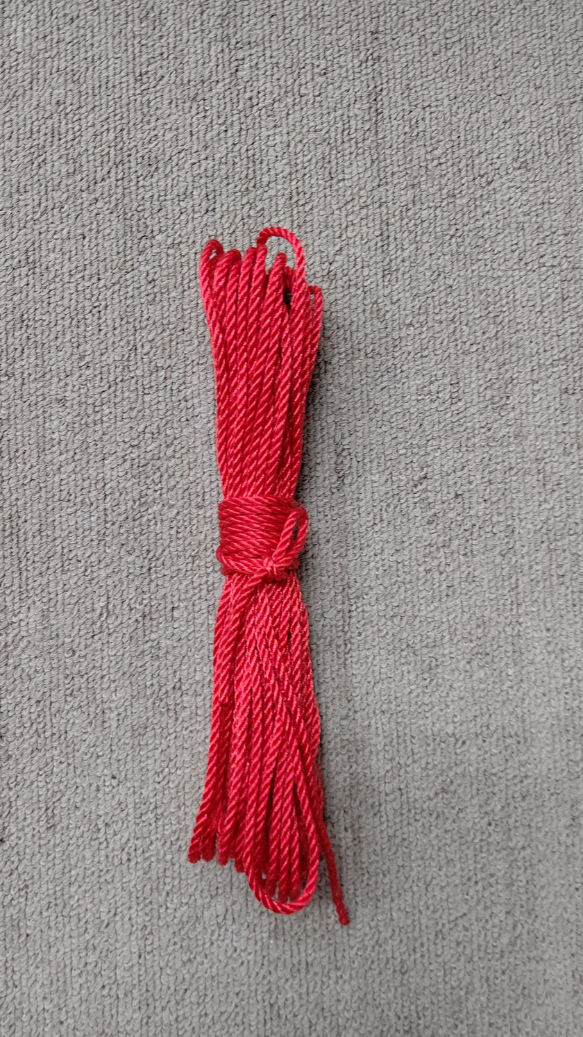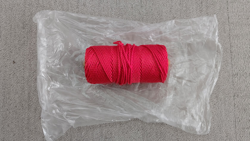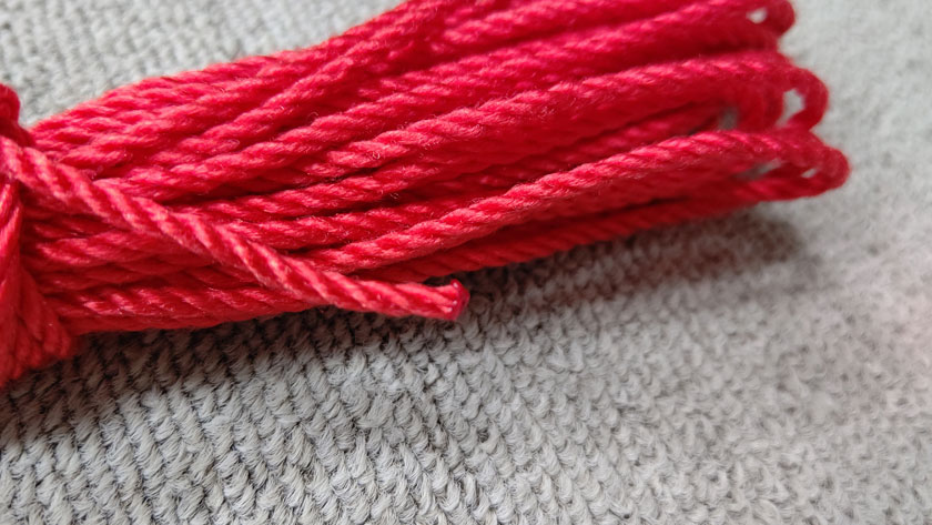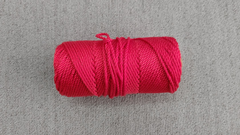 存在感のある赤色のポリエステル製ロープです。後染めではなく、原着糸という糸の生成時に赤色を入れているので、耐候性(色褪せ)に強いロープです。