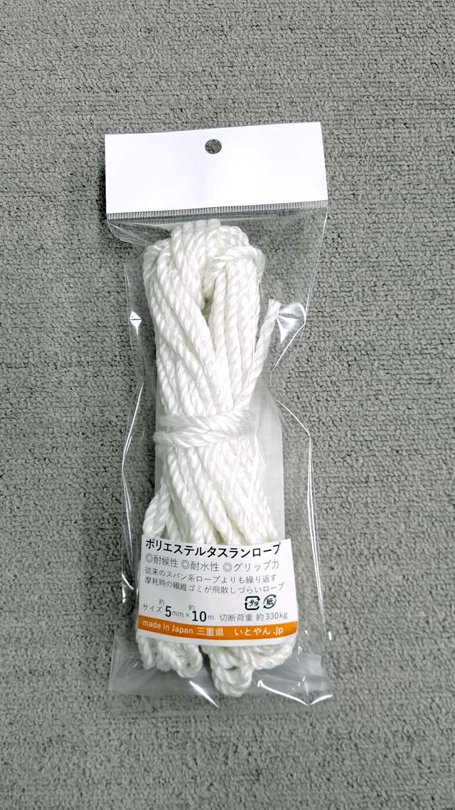 タープ・テントロープ 5mm 10m 白 ポリエステル製 タスランガイロープ 国産 3つ打ち アウトドア・キャンプ用